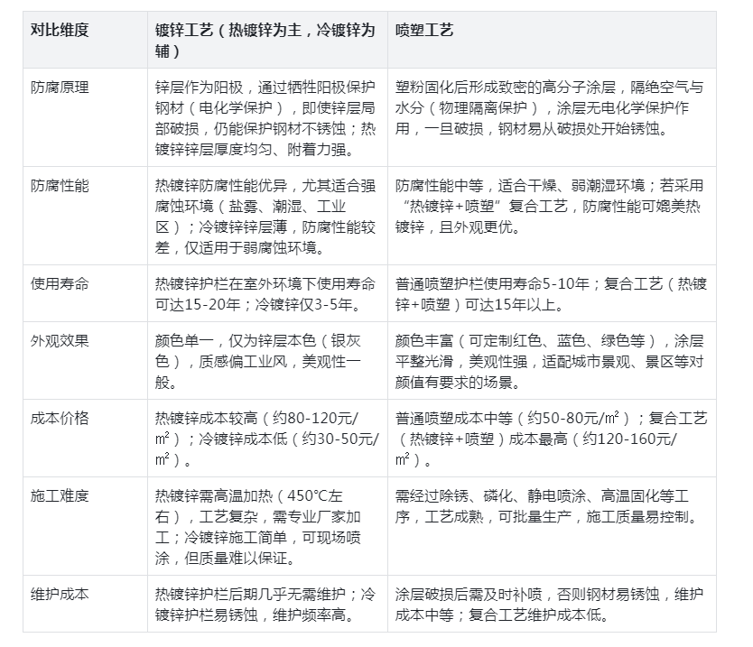 镀锌(热镀锌/冷镀锌)和喷塑(粉末喷涂)均是护栏常用的表面防腐工艺,核心目的是隔绝空气、水分与钢材接触,防止锈蚀。两者的差异主要体现在防腐性能、使用寿命、外观效果、成本、适用环境等方面,具体对比及选择建议如下: