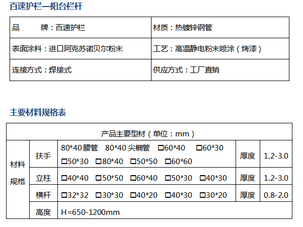 阳台护栏采用最先进的"三防"(防锈、防腐、防拆)的制作工艺,为住宅小区、别墅、工业园区、机关单位、公园、公路、铁路等场所刻画出一道道亮丽的风景线。外观:色泽鲜艳、不褪色。抗冲击强度:坚固耐用、抗冲击强度高。使用寿命长:一次性投入,终生享用。耐候性好:耐高温、抗低温、耐盐雾、抗潮湿。维护成本低:免维修、易清洗。从基材、配件到涂装,均采用优质品牌产品,从根本上保证产品品质。
